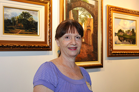 A artista plástica Raquel Bety posa com suas três obras em óleo sobre tela
