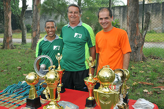 Athos, Félix e o diretor de esportes, José André, junto à mesa de troféus