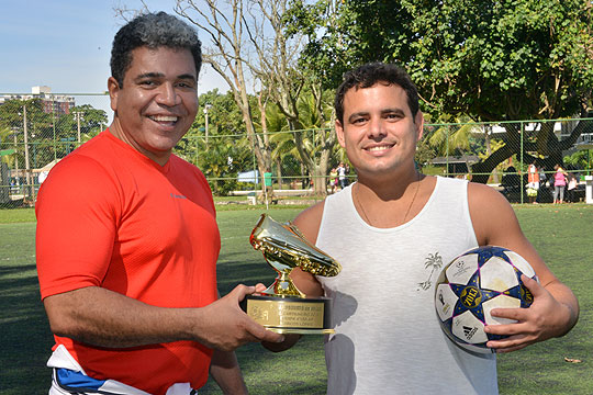 O diretor Milton Coelho entrega o troféu de artilheiro a Marcos Lopez (Exim-AP): 13 gols em todo o campeonato
