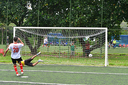 A bola bate nas duas traves antes de fugir do gol: Vingadores campeões