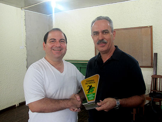 João Carlos Branco, vencedor do desafio dos campeões, recebe troféu do presidente da AFBNDES, Mauro Bottino