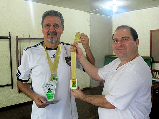Com troféu e medalhas, Paulo Altomar, campeão do 2º Torneio de Sinuca da AFBNDES e autor da melhor tacada do dia, em foto com Mauro Bottino