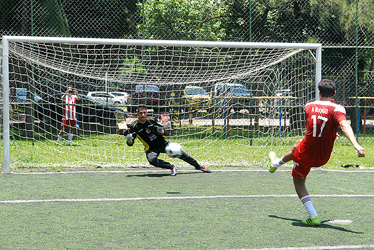 Disputa de pênaltis - Gonçalo Ribeiro (Joiúdos) defende chute de Marcio Oliveira (À Bangu)