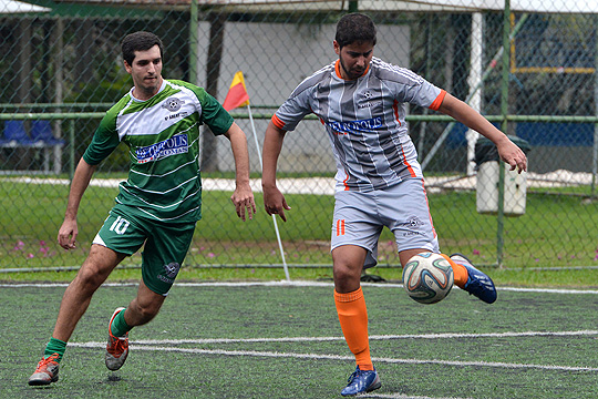 Luciano Bezerra (AGIRH) conduz a bola, sendo acossado por Caio Barboza (AGRISAP)