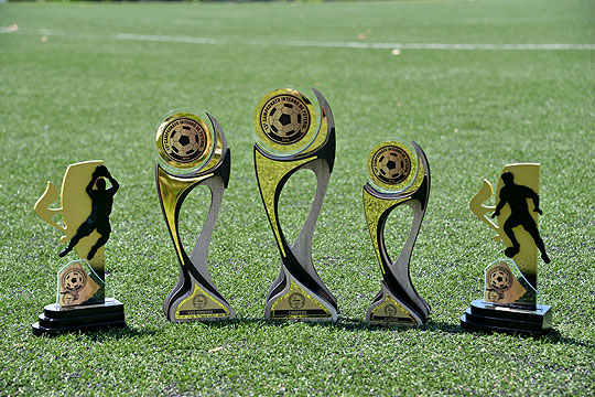 Premiação: os belos troféus de campeão, vice, 3º colocado, defesa menos vazada e artilheiro