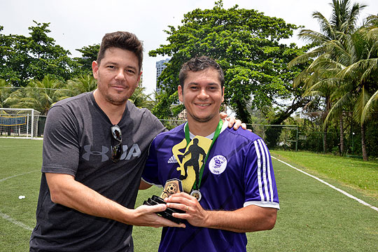 O diretor de esportes Eric Flores entrega o troféu de artilheiro ao jogador Vinícius Barreto (El Niño)
